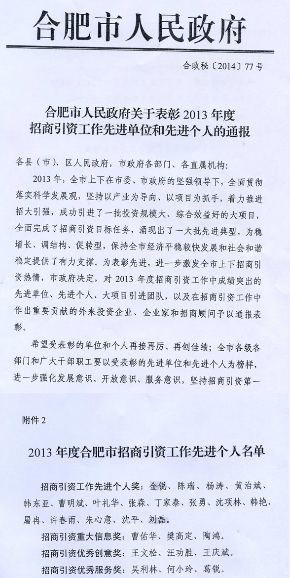 熱烈祝賀我司總裁陶鴻先生在合肥市人民政府招商引資工作先進(jìn)單位和先進(jìn)個(gè)人評(píng)比中,榮獲“招商引資重大信息獎(jiǎng)”。