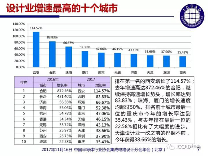 根據(jù)魏少軍理事長(zhǎng)的報(bào)告:由于存儲(chǔ)芯片大幅增量和晶圓制造產(chǎn)能緊張導(dǎo)致價(jià)格上升,2017 年全球集成電路產(chǎn)業(yè)出現(xiàn)20%的增幅,有望邁過(guò)4000億美元大關(guān) 。同時(shí),2017年我國(guó)集成電路設(shè)計(jì)總銷(xiāo)售額為1945.98億元人民幣,較2016年增長(zhǎng)28.15%,增速繼續(xù)名列全球第一,為全球集成電路產(chǎn)業(yè)的增幅提供了源動(dòng)力。在產(chǎn)業(yè)熱點(diǎn)城市方面,合肥市集成電路設(shè)計(jì)業(yè)繼2016年實(shí)現(xiàn)872.46%的高速增長(zhǎng),名列全國(guó)第一后,在2017年又取得了83.83%的高速增長(zhǎng),增速位居全國(guó)第二位,保持著良好的發(fā)展勢(shì)頭。